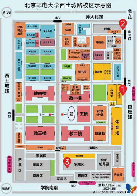 1. 体育馆东侧 2. 东北门 3. 南家属区