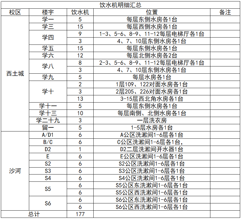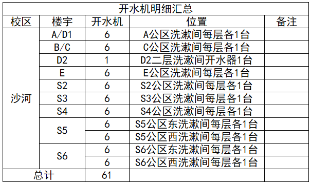 •开水器用水(沙河校区):全免费供应,插入校园卡即可使用,无额外费用。