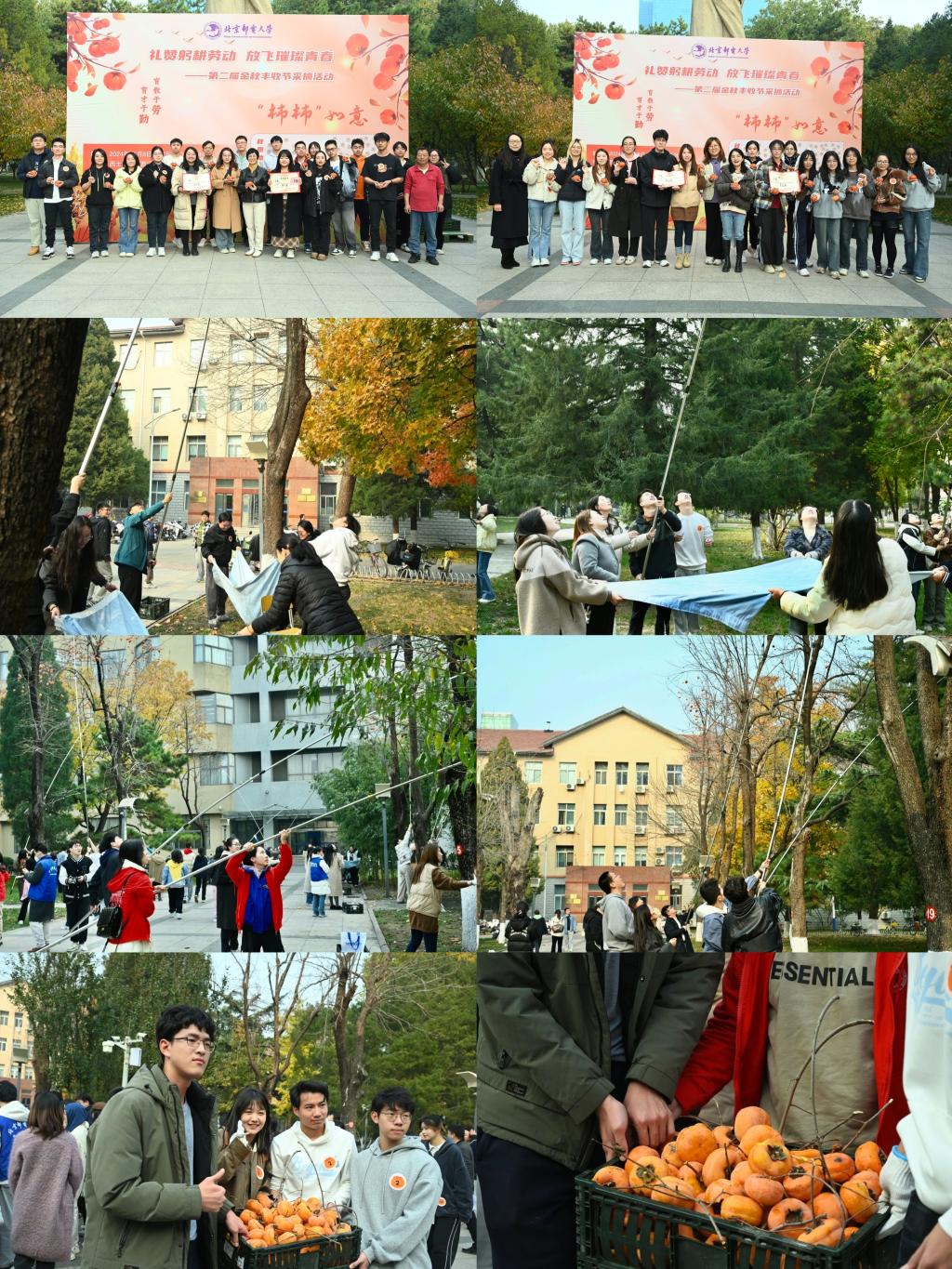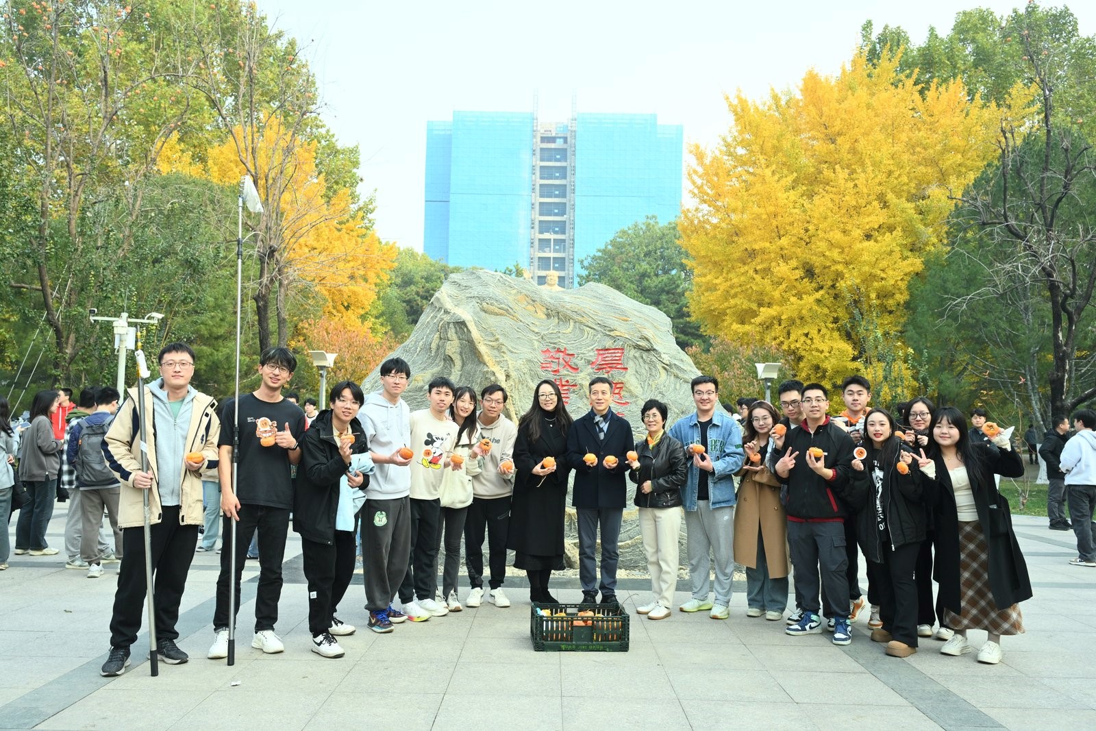 在海淀校区“柿柿”如意活动现场,152名师生临时组成了 19支师生联队,面对一颗颗红红的“小灯笼”,十八般武艺,各显神通,争当柿王。虽非专业选手,但队员们动作行云流水:瞄准目标,套住柿子,一转竿子,“咔嚓”一声,其他队员眼疾手快,迅速承接,柿子便收入筐中。有的在树上钩,有的在地上捡,还有的扯着单子接,好不热闹,灿烂的笑容挂满青春的脸庞。他们比拼的不止是重量,还有对劳动的热爱之心,收获的不止是柿子,还有师生一起劳作的美好回忆。