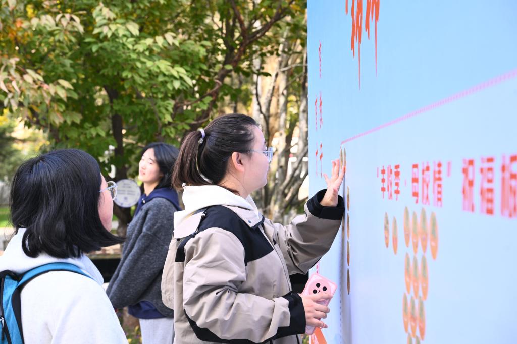 与采摘的热闹形成温情呼应的,是“寄心语”环节的动人场景。在“丰收季・母校情”展板前,师生们提笔写下对北邮70华诞的祝福:“愿母校如柿树长青,续写邮路华章”“七十载躬耕育人,盼十年后再赴80华诞之约”;另一侧的“70周年时光信箱”前,不少人将写满对学校未来期许的明信片轻轻投入——这份承载着深情的“时光礼物”,将被妥善封存至2035年建校80周年,成为跨越十年的校庆记忆。