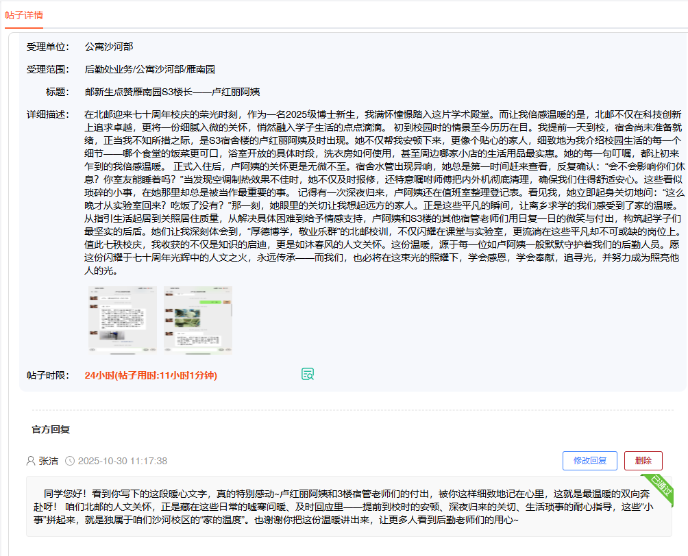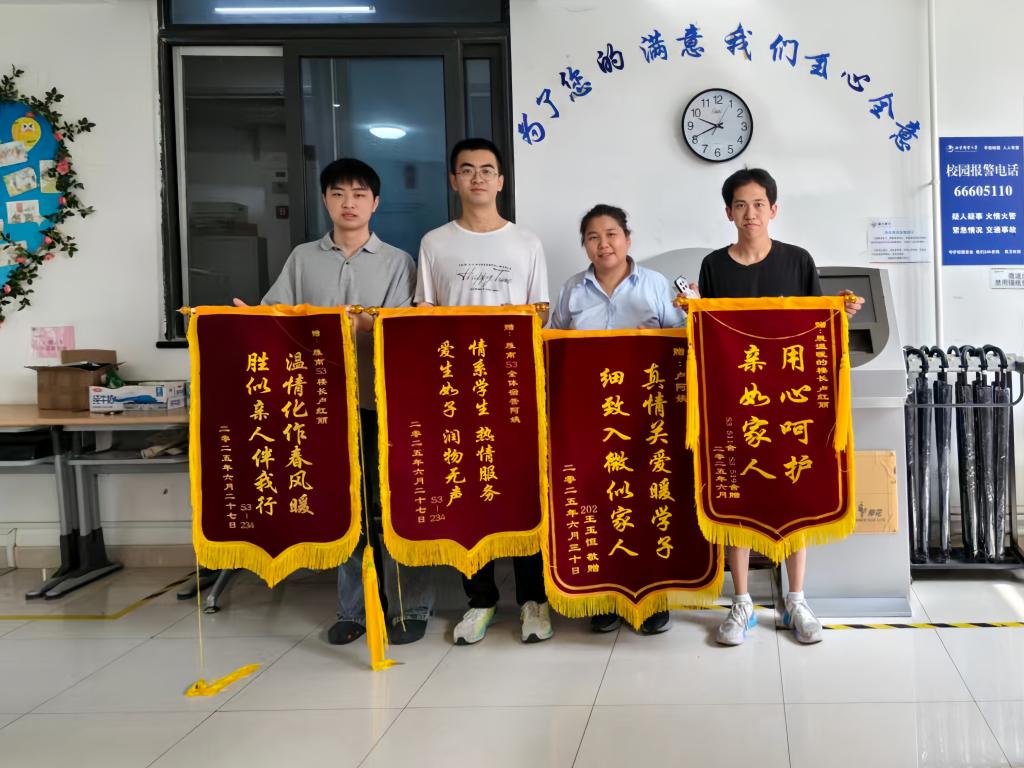 沙河校区雁南园S3楼宿管卢丽红获新生致谢。新生入学期间,她主动协助搬运行李,详细介绍各类生活设施使用方式,并及时响应报修,以细致服务帮助新生适应校园生活。