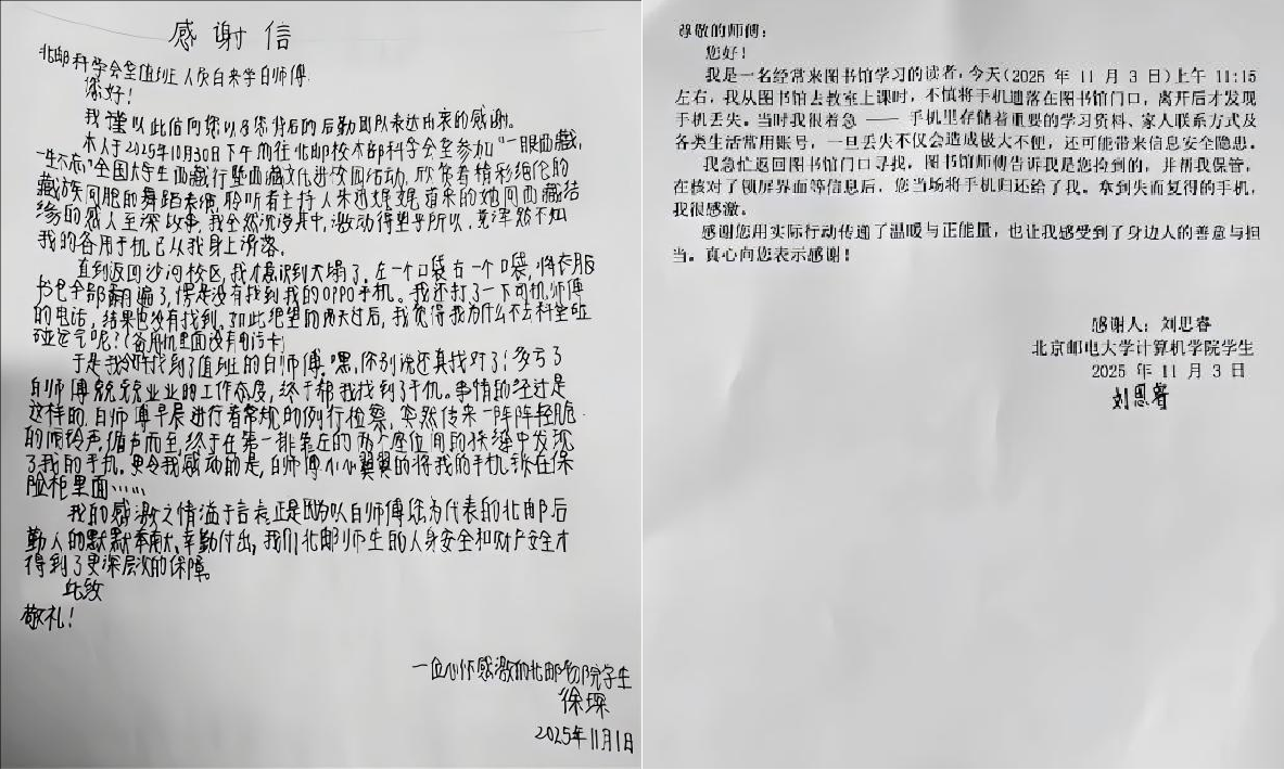 近日,后勤部陆续收到四封来自师生及家属的感谢信,贴心护学、拾金不昧、紧急救老...纸短情长,后勤人与北邮师生双向奔赴、情谊深厚,暖心的片段串联成篇,展现出物业服务的责任与温度。