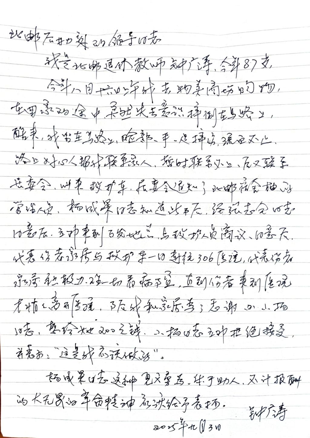 二里庄值守点师傅在紧急事件中妥善处置,获退休教师家属感谢。一名87岁退休教师外出时不慎摔倒,值守人员接报后迅速赶到,协助送医并垫付部分费用,事后婉拒酬谢。
