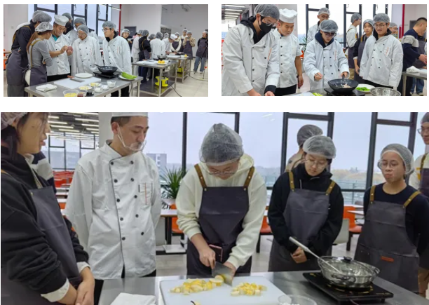 后勤育人是学校育人体系的重要基石,后勤部始终坚守“服务育人”初心,将课堂搬进餐厅、以实践替代说教。活动前,团队精心统筹场地布置、食材甄选、厨师调配等全流程,以专业保障为劳动教育筑牢根基;课堂上,专业厨师化身“育人导师”,从食材挑选的门道、处理的细节,到调味的比例、火候的掌控,层层拆解烹饪技艺,更在同学们实操过程中实时指导、精准点拨,让每一次切配、翻炒都成为技能提升的契机。