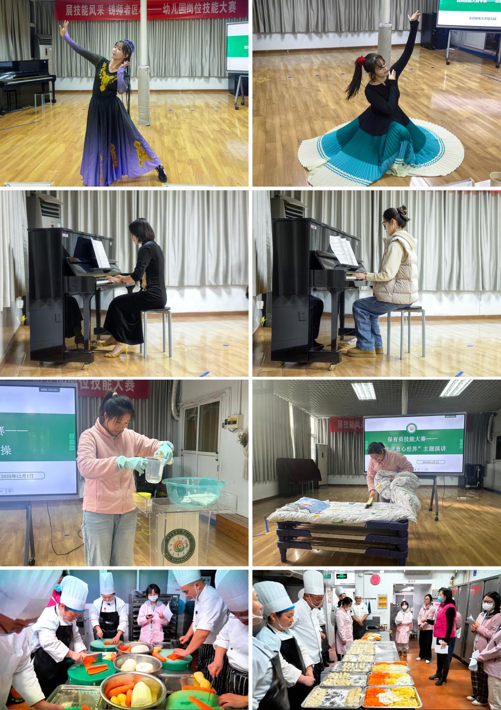 本次大赛内容针对不同岗位的工作职责与核心技能精心设计,覆盖面广、实操性强。食堂人员在厨艺比拼中展现了包饺子、炒三丝、烙馅饼等扎实功底;保育员队伍则通过“走进童心世界”主题演讲及床铺整理、消毒配比等日常操作,彰显了专业的保育素养;全体教师的考核更为多元,涵盖了教育理念抽题答辩、规定儿歌弹唱,以及自选钢琴演奏或民族舞表演,全面展示了其保教能力与艺术表现力。