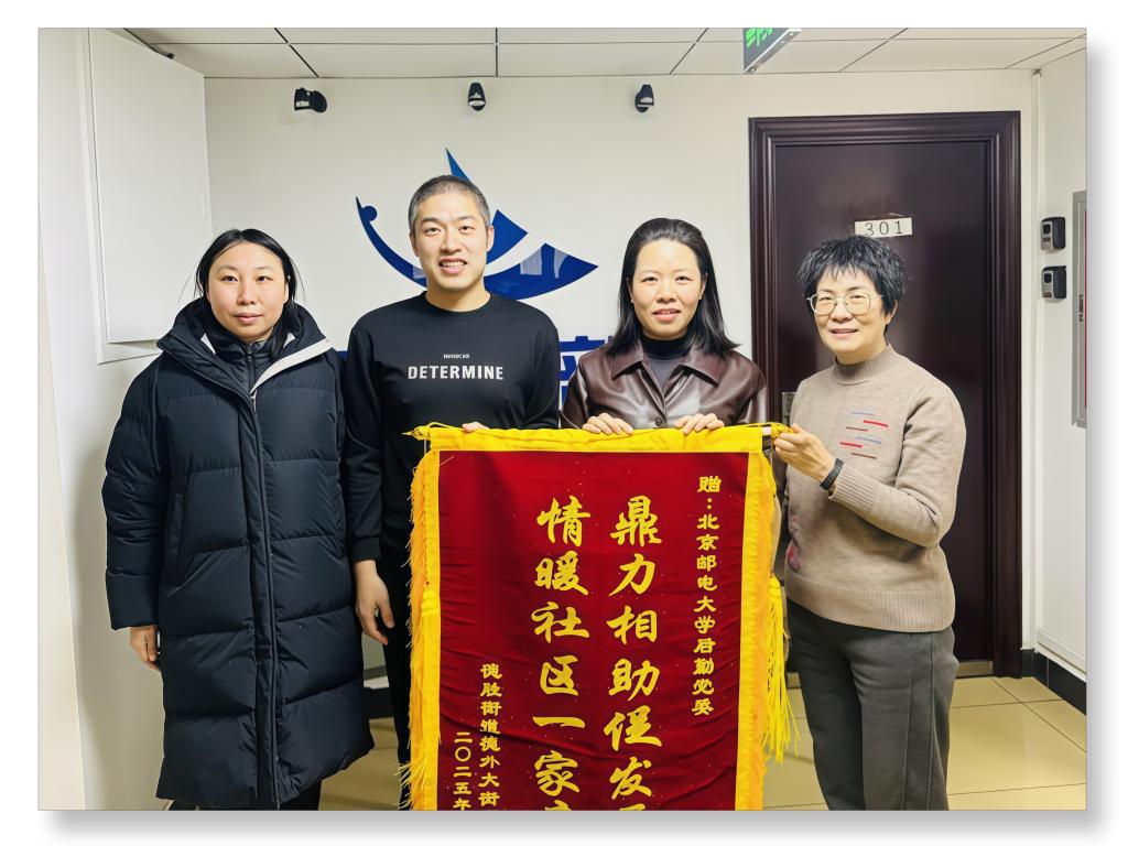 2026年1月9日,德胜街道外大街西社区党委书记、居委会主任王文娟一行专程来校,代表社区党委向北邮后勤部赠送锦旗,对后勤部过去一年给予的大力支持与共建协助表示诚挚感谢。