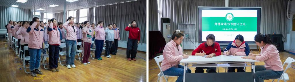 师德培训筑根基。组织开展“以法为纲 以德润心”师德培训,深入学习《学前教育法》及教师职业行为准则,引导教师依法执教、以爱育人。全体教师重温誓词,签订师德承诺书,以承诺强化责任担当。