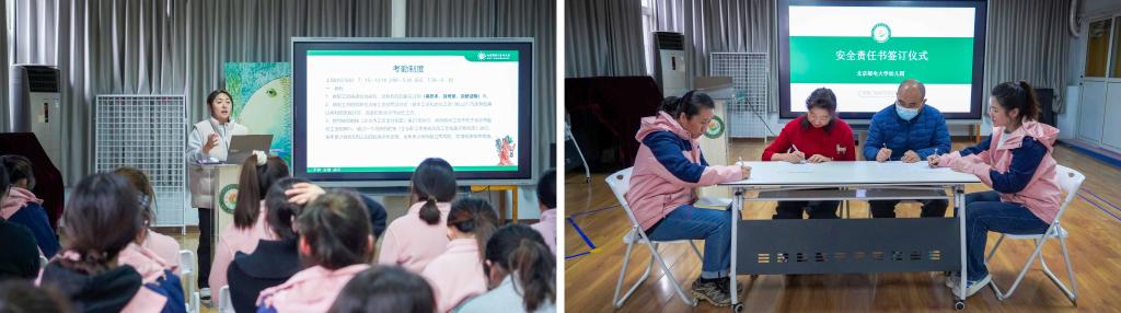 安全护航压责任。围绕考勤管理、幼儿接送、意外防控、传染病防治等重点领域开展安全培训,剖析风险点、明确责任人。全体教职工签订安全责任书,层层压实校园安全防线。