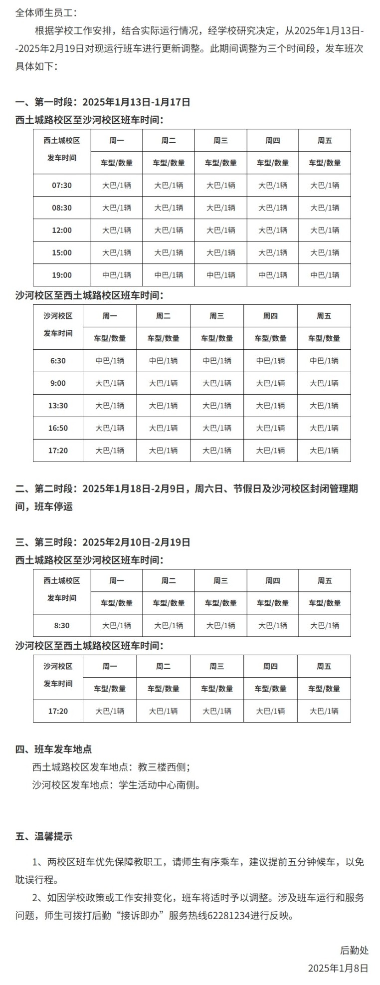 关于两校区寒假期间班车运行调整的通知