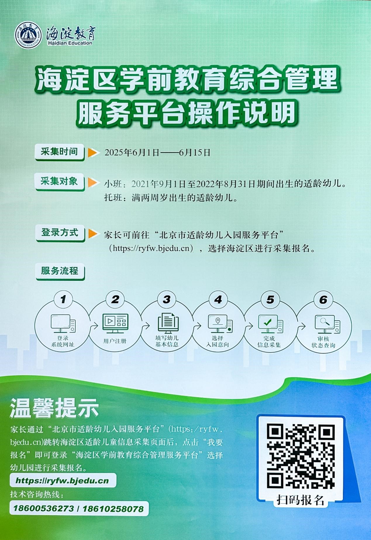 (一)报名方式:家长可前往“北京市适龄幼儿入园服务平台” (https://ryfw.bjedu.cn),选择海淀区进行采集报名。
