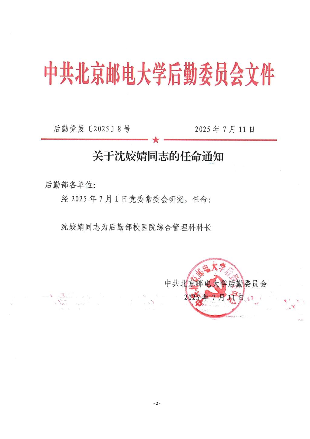 关于沈姣婧同志的任命通知