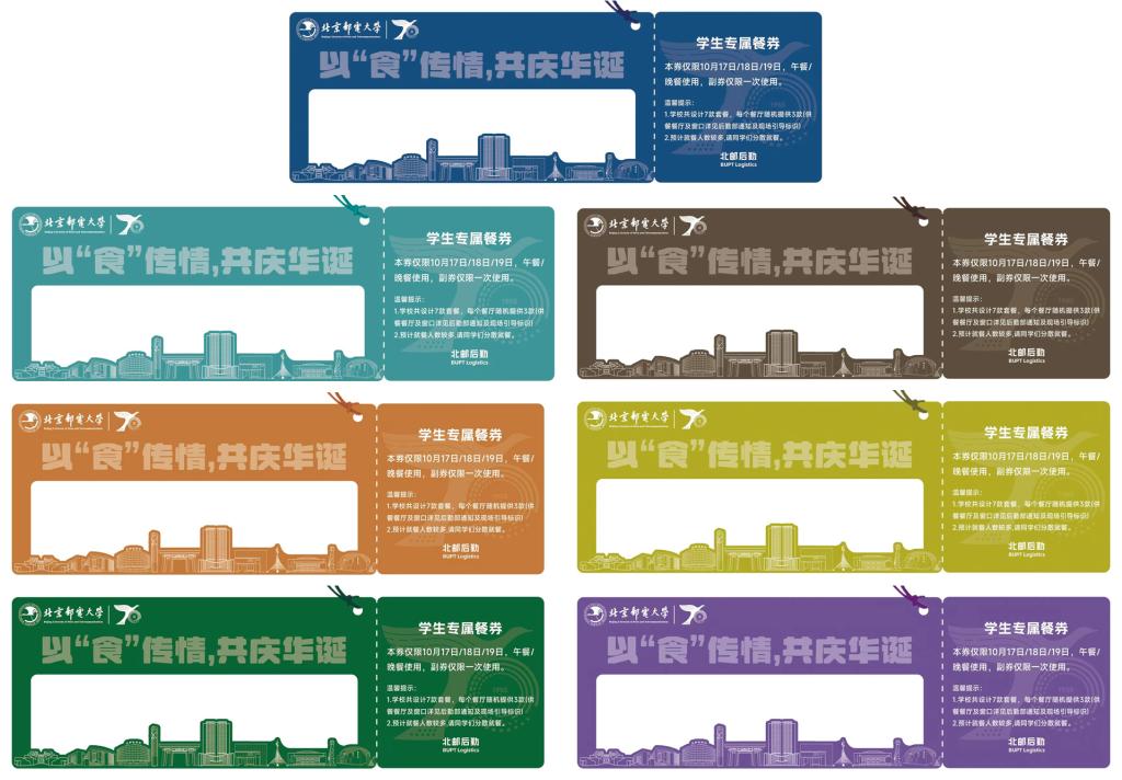 以“食”传情,共庆华诞。在建校70周年盛典之际,为传递校庆的喜悦与荣光,根据学校安排,后勤部特推出7款套餐,对应学校发展的7个10年,承载着学校对同学们深深的情谊与祝福。后勤部同步设计制作了7款“学生专属餐券”,向全体在校学生发放。