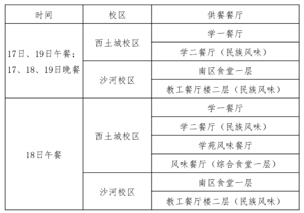 温馨提示:预计西土城校区18日午餐时段返校校友较多,食堂供应能力及座位数有限,建议同学们错峰带回宿舍就餐。