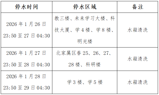 根据后勤工作计划安排,拟对西土城校区及部分家属区的二次供水水箱开展清洗作业,对小西天校区和沙河校区的水表计量器具进行更换,届时将实施临时性停水,具体安排如下: