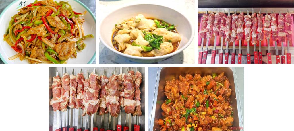 铁板五花肉炒饭、泡椒鲜牛肉、干拌老麻抄手、大羊肉串,满足大家的不同饮食需求。