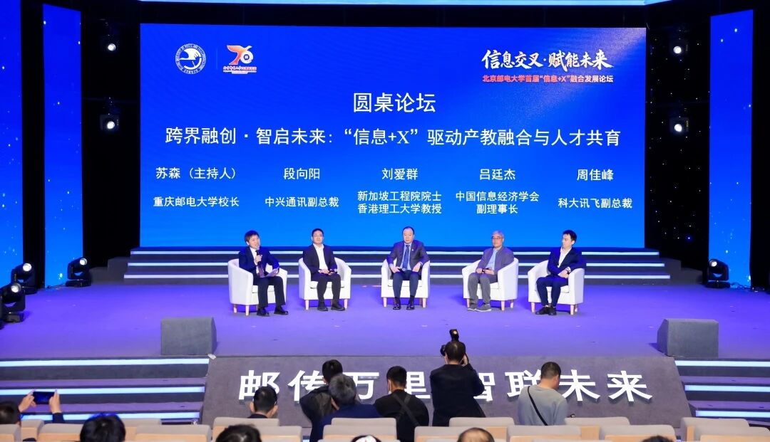 重庆邮电大学校长苏森教授在主持圆桌论坛时,围绕“跨界融创・智启未来:信息+ X驱动产教融合与人才共育”,与新加坡工程院院士、香港理工大学量子技术研究院院长刘爱群,中国信息经济学会副理事长、北京邮电大学经济管理学院教授吕廷杰,中兴通讯副总裁段向阳,科大讯飞副总裁周佳峰四位嘉宾展开深度对话,共同分享关于教育科技人才一体化推进的前瞻视野。