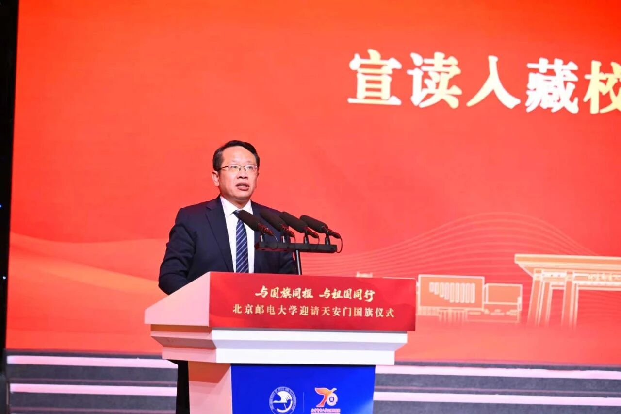 徐坤校长宣读国旗及证书入藏校史馆的决定。这面编号为2025-0291的天安门国旗将永久珍藏于校史馆。全校上下要以国旗入藏校史馆为契机,充分发挥国旗作为爱国主义教育重要载体的功能作用,激励北邮学子涵养爱国报国情怀、增强爱校荣校意识,以青春之我扛起时代重任,以奋进之姿勇攀科技高峰。