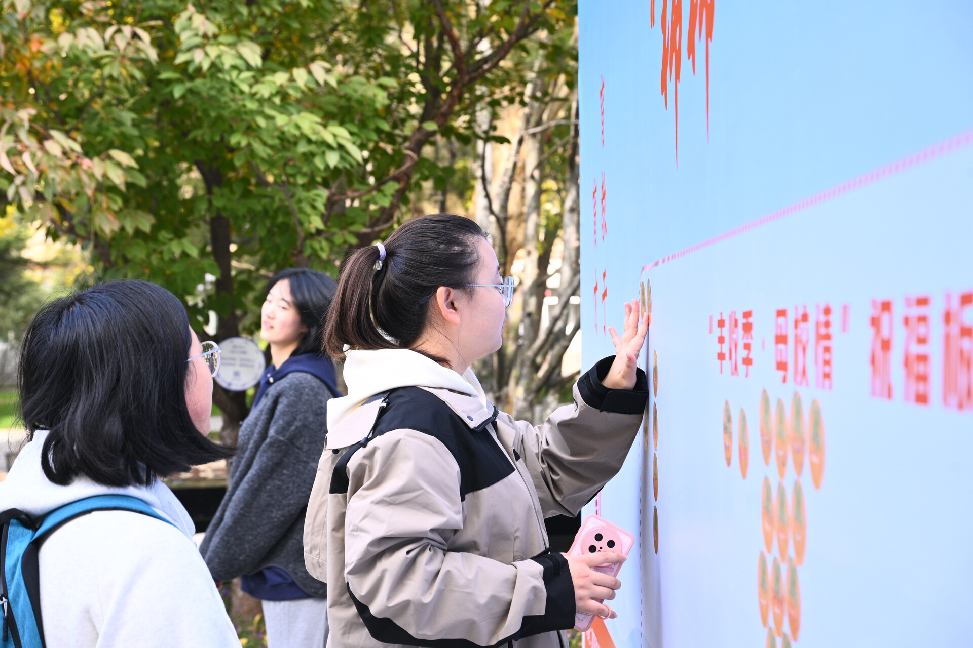与采摘的热闹形成温情呼应的,是“寄心语”环节的动人场景。在“丰收季・母校情”展板前,师生们提笔写下对北邮70华诞的祝福:“愿母校如柿树长青,续写邮路华章”“七十载躬耕育人,盼十年后再赴80华诞之约”;另一侧的“70周年时光信箱”前,不少人将写满对学校未来期许的明信片轻轻投入——这份承载着深情的“时光礼物”,将被妥善封存至2035年建校80周年,成为跨越十年的校庆记忆。